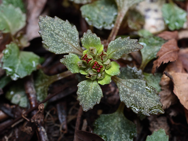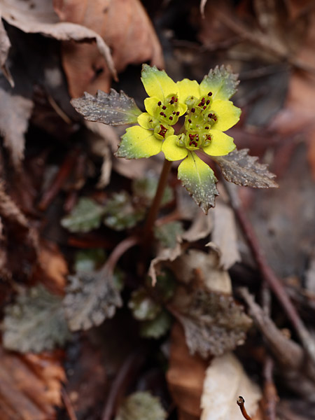 | 本州(岩手県以南)の太平洋側と四国に分布し、山地の谷沿いに生えるネコノメソウの仲間です。分類学的には本州の関東地方以西と四国・九州に分布するイワボタンの変種の1つです。淡黄緑色のがく裂片はよく平開し、黄色を帯びた苞葉に赤い葯がアクセントを添えます。福島県内では浜通りと中通り地方で見られ、私たちが見かける機会も多く、浜通り地方では3月中~下旬頃から開花します。県内には同じイワボタンの変種であるヨゴレノコノメの記録がありますが、本種の誤認のようで、がく裂片が直立する点などで本種と識別されます。 |