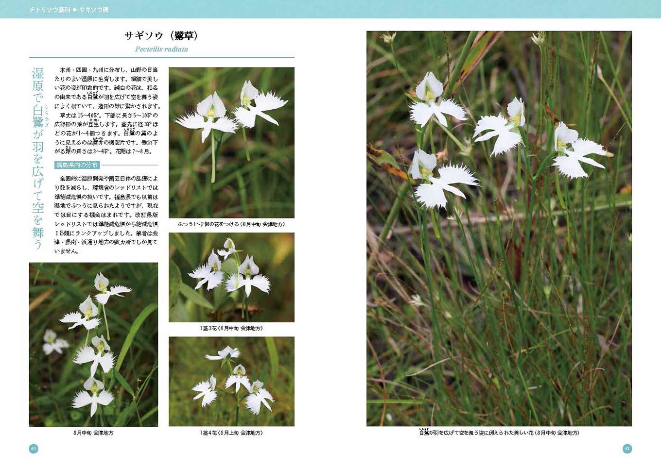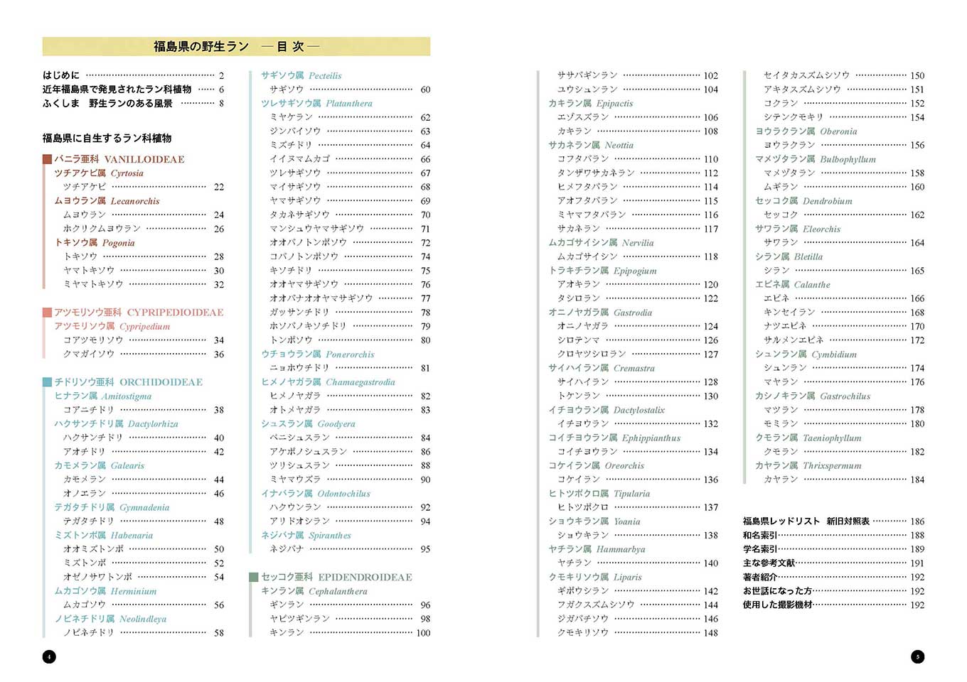 ↑ 目次です。掲載種の配列は基本的に『日本のラン ハンドブック ①低地・低山編』(文一総合出版)中の「日本産ラン科植物分類表」に準拠しました。各種のページのほかに、近年福島県で発見されたラン科植物の特集、野生ランの群生写真集、福島県レッドリストの新旧対照表などを掲載しました。 |