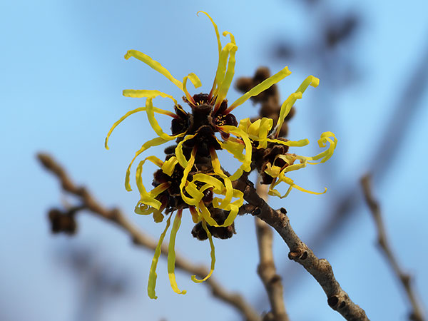 | 1/13/2026 | トップページの花の写真をシナマンサクに変更。 郡山市内の自然公園で見られるシナマンサクが咲き始めていました。1月中旬頃から咲き始め、開花時も枯葉が枝に残りますが、在来のマンサクは2月以降に開花し、その頃には葉が落ちています。 葉はシナマンサクの方が一回り大きく、裏面に綿毛が密生しています。花もシナマンサクの方が大型で色が濃く、花弁の基部が赤みを帯びている点で見分けられます。 |